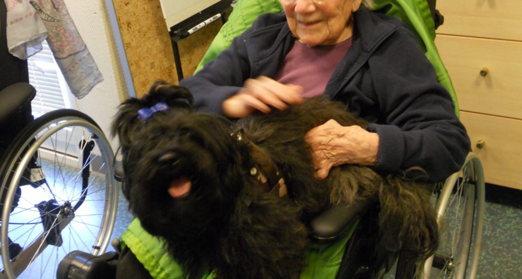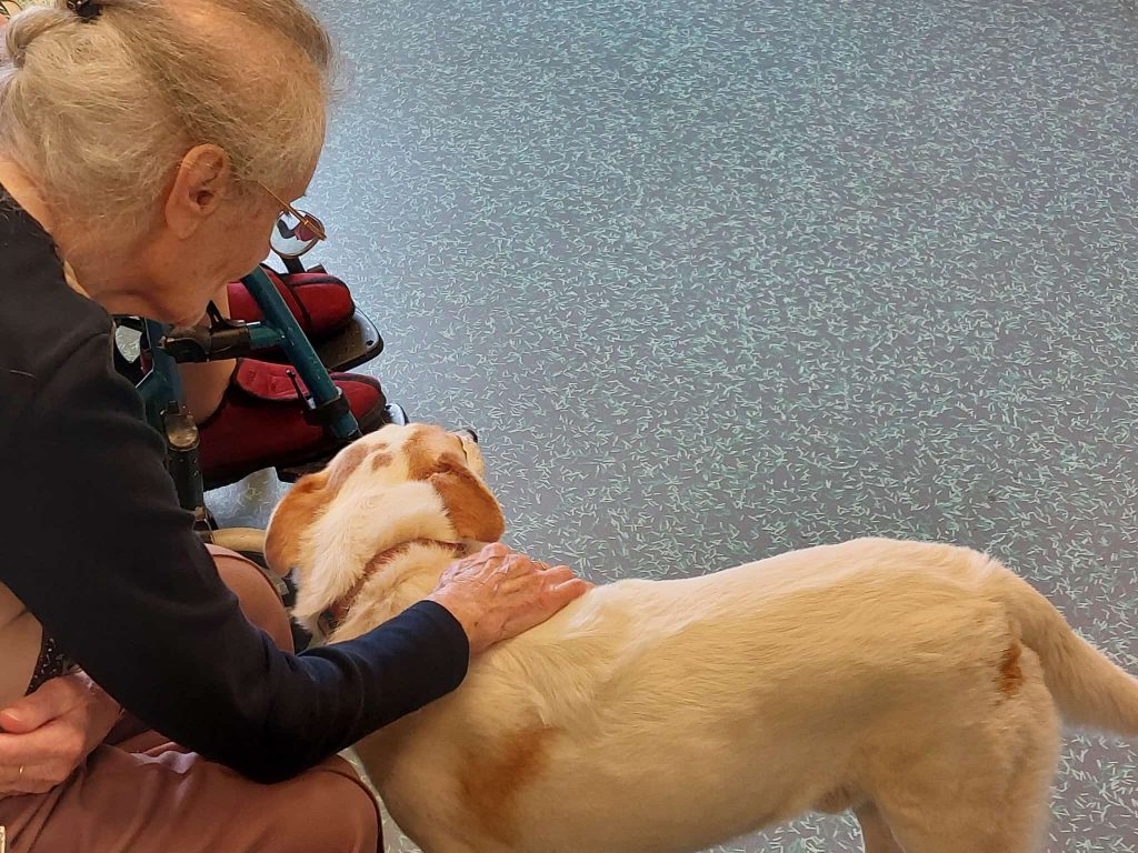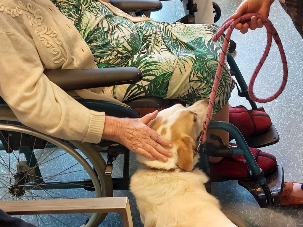 Environ 12 personnes assises en cercle dans la salle d’animation les attendent, en présence de l’animateur et d’autres accompagnantes parfois. Les personnes présentes ont demandé à venir voir les chiens. Caresses aux chiens, présentation de chaque résident, présentation des chiens. Questions réponses, discussions, souvenirs…
